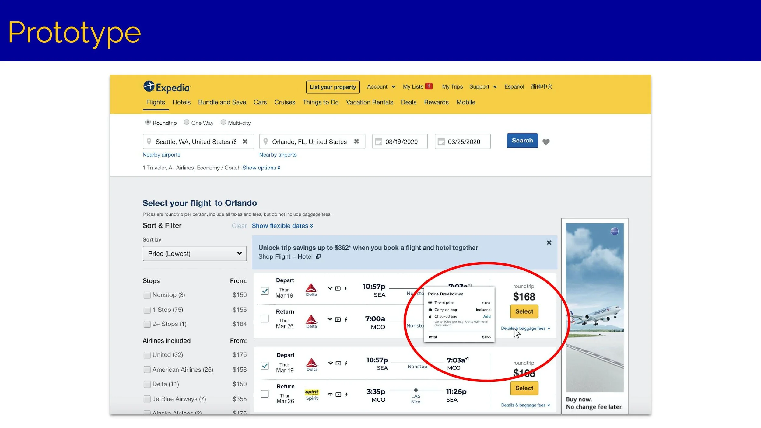 As part of our degree program, we examined a small aspect of Expedia’s desktop website: the flights search results page. We conducted content, mobile and accessibility audits, made new strategy recommendations and presented prototypes to visualize the strategy.
